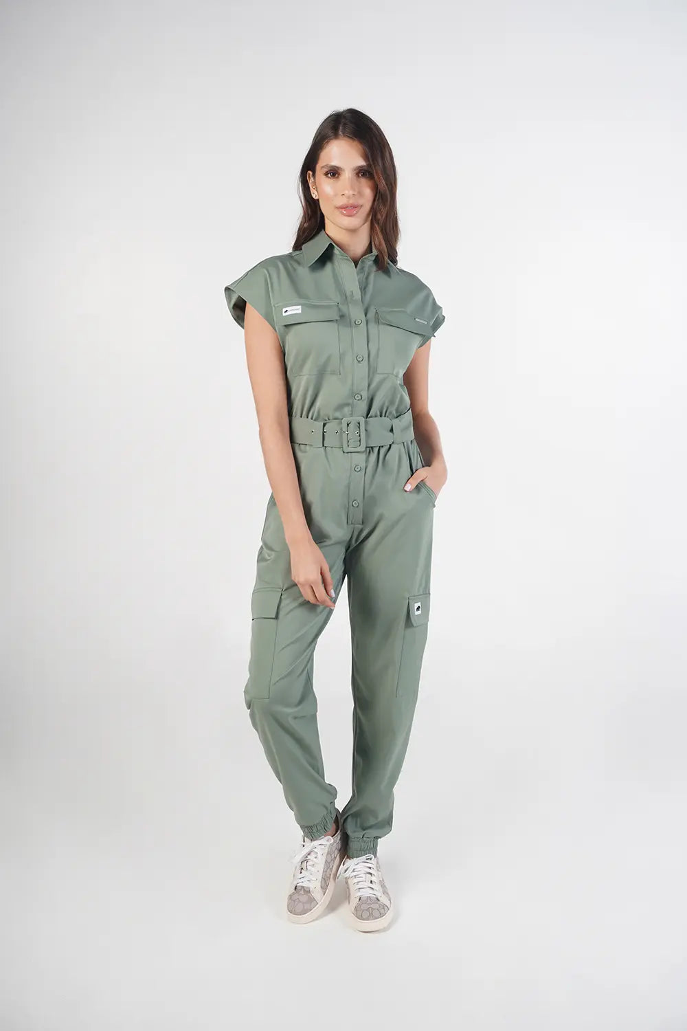 Cargo-style jumpsuit, front pockets at chest height and side pockets at mid-leg height with waist adjustment with belt, jogger-style boot, loose fit