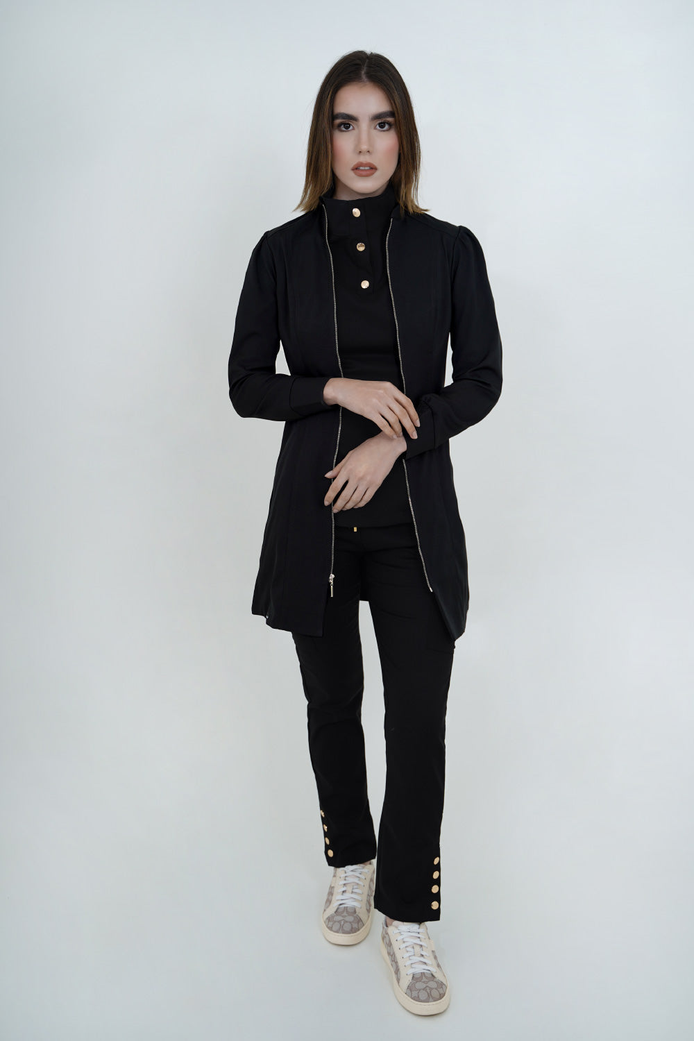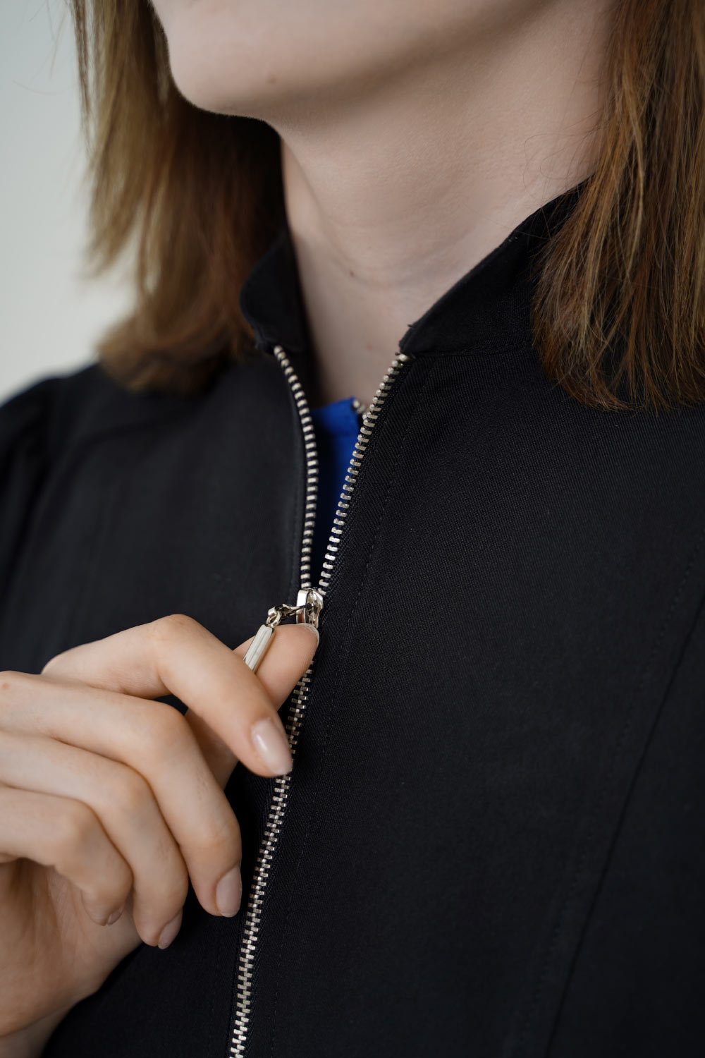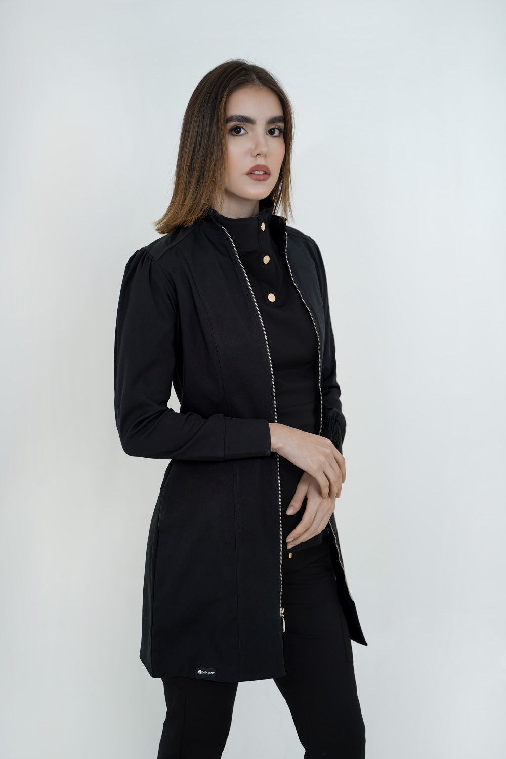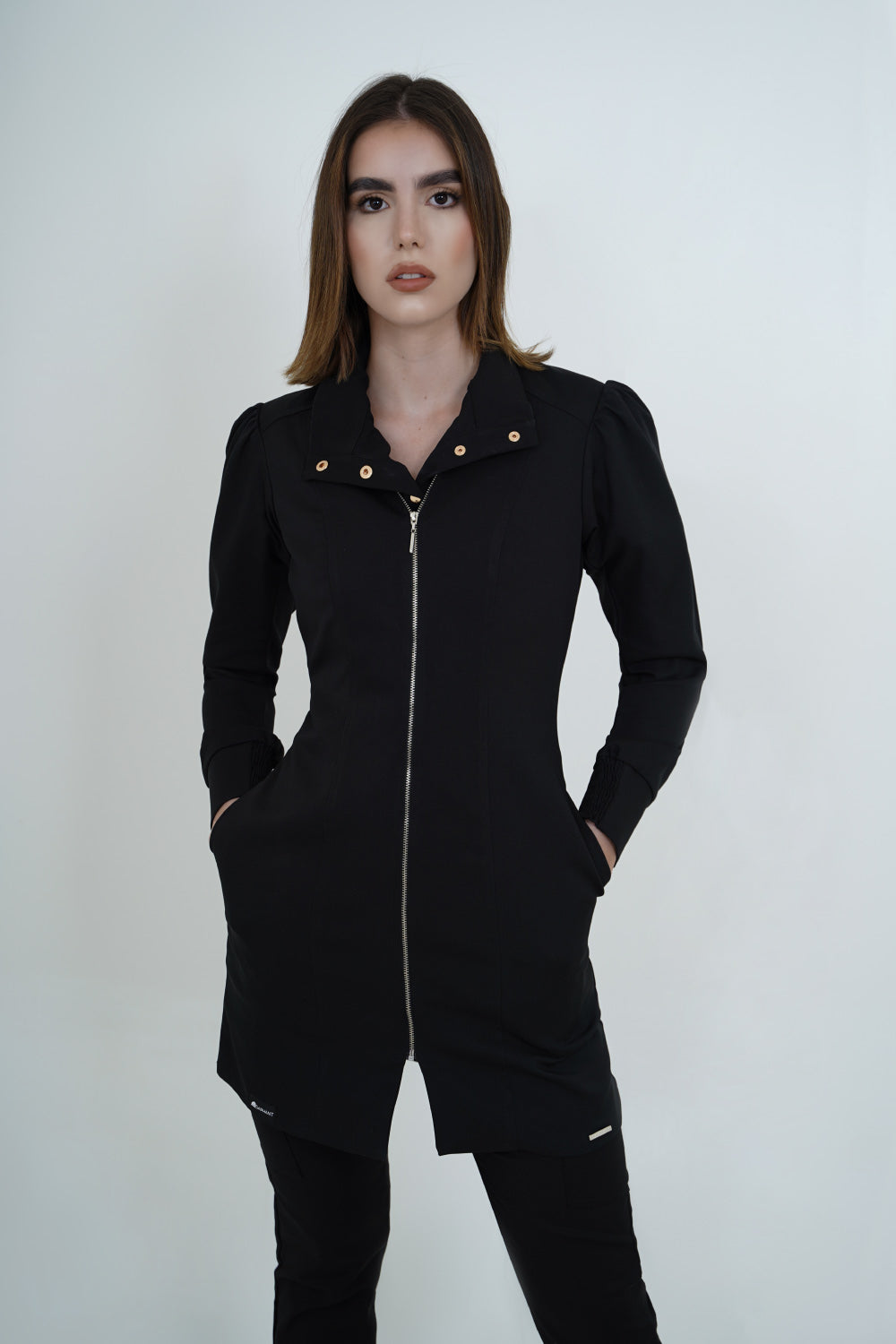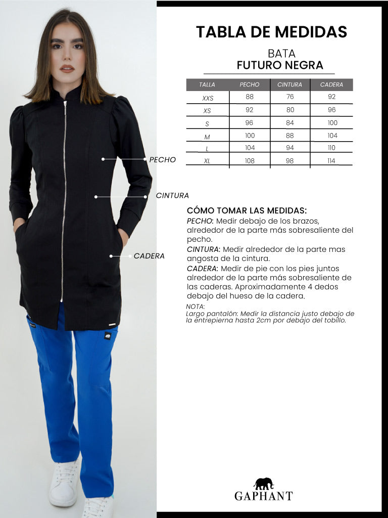 Bata color negra con cierre, bolsillos laterales, manga tipo globo, horma ajustada, protección solar, antífluido, 100% poliester