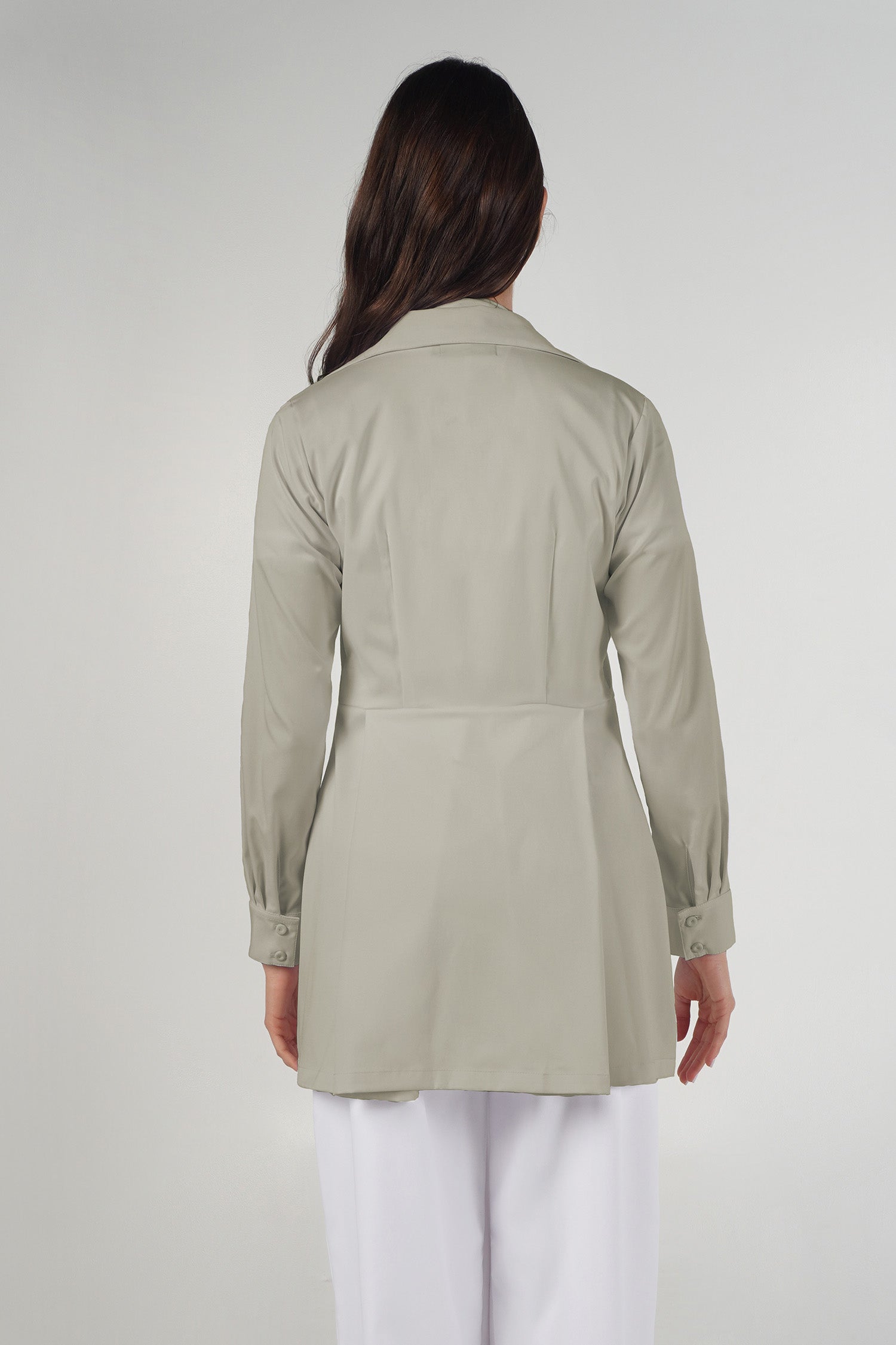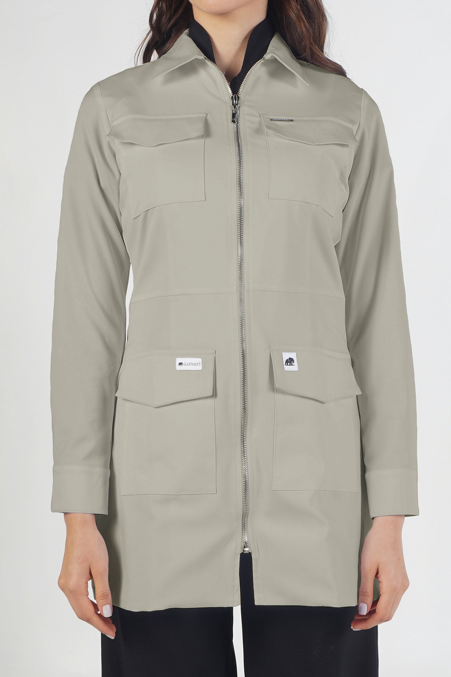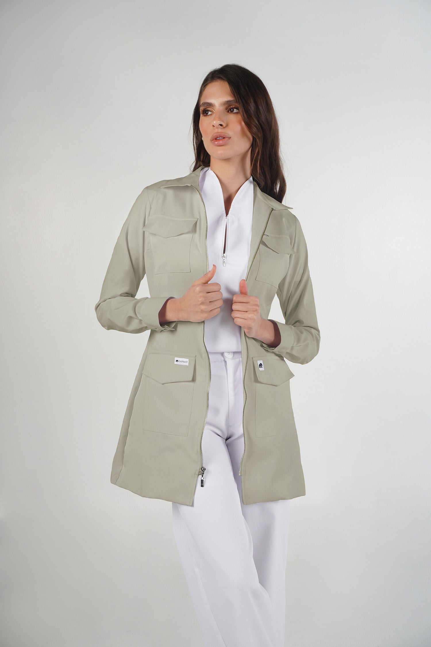 Bata color caqui con cierre, tipo campana, con 4 bolsillos frontales, horma holgada