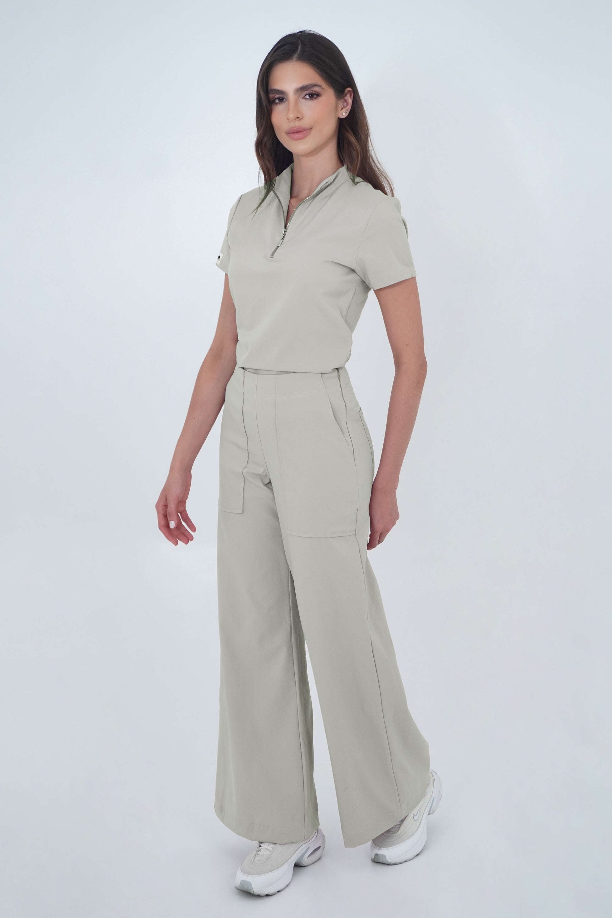 Este uniforme médico es la combinación perfecta entre versatilidad, estilo y funcionalidad. La camisa con cierre integrado te permite crear looks diferentes, y el pantalón bota recta amplia, con bolsillos prácticos, se adapta a cualquier situación