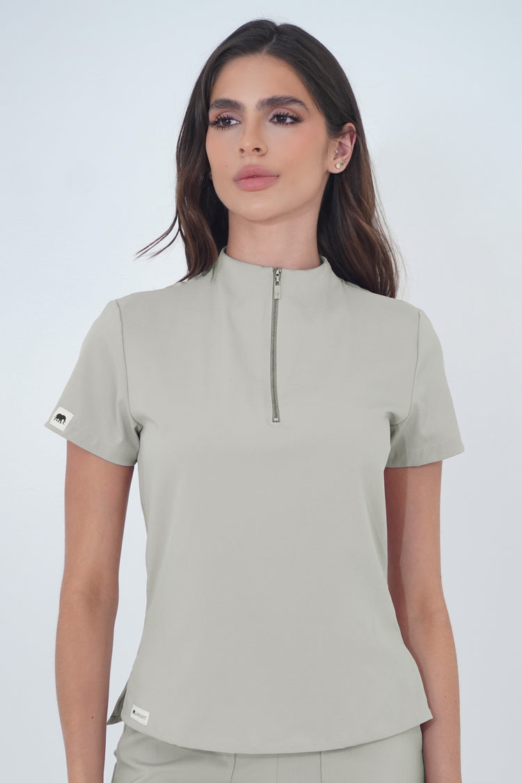 Camisa cuello integrado semi alto con cierre metálico frontal, horma ajustada, Composición: 96% Poliester 4% Lycra