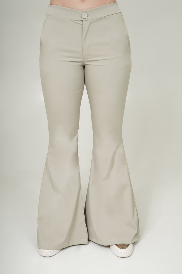 Pantalón bota campana, con ajuste de botón, pretina resortada en la parte de atrás.