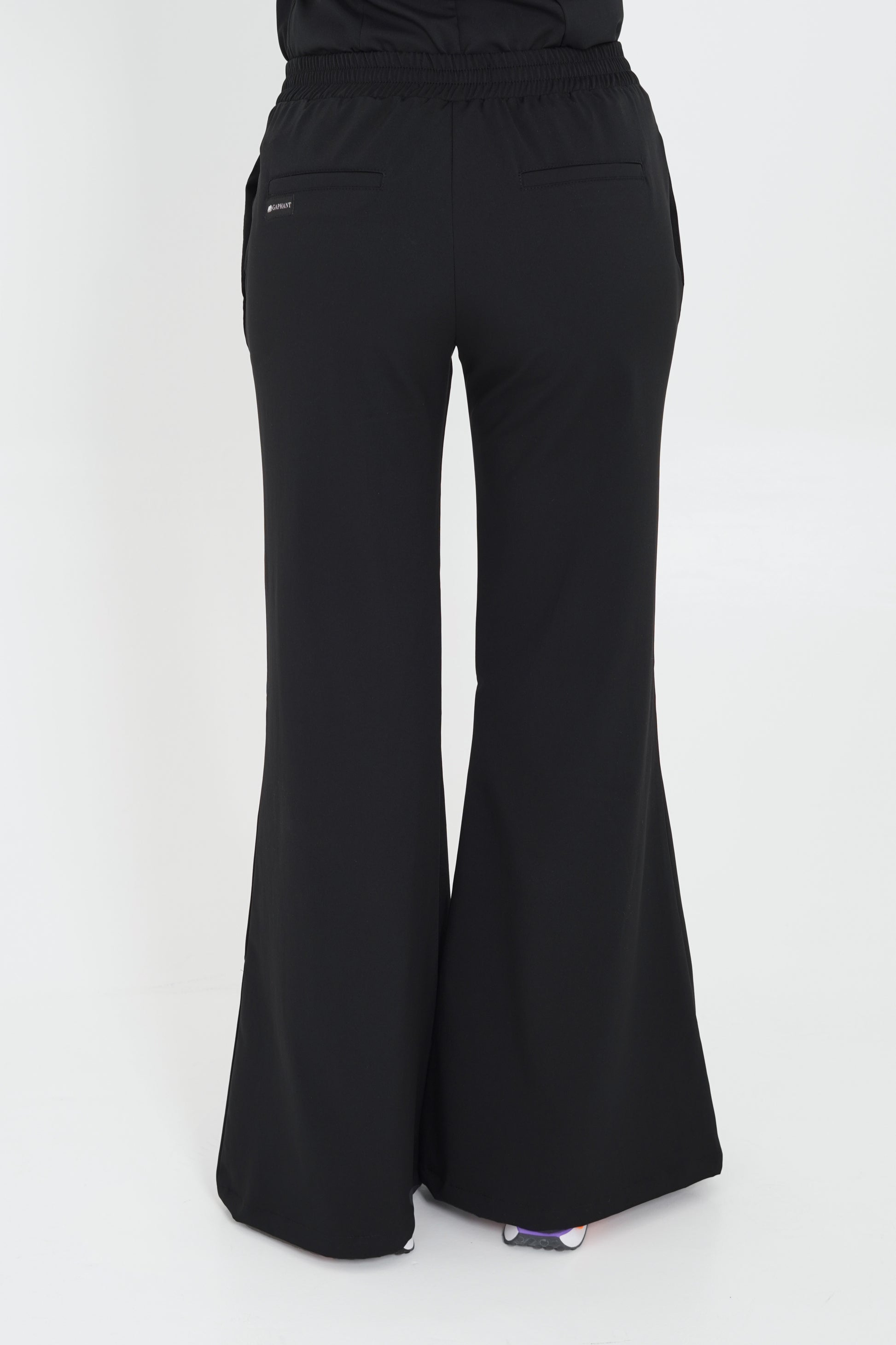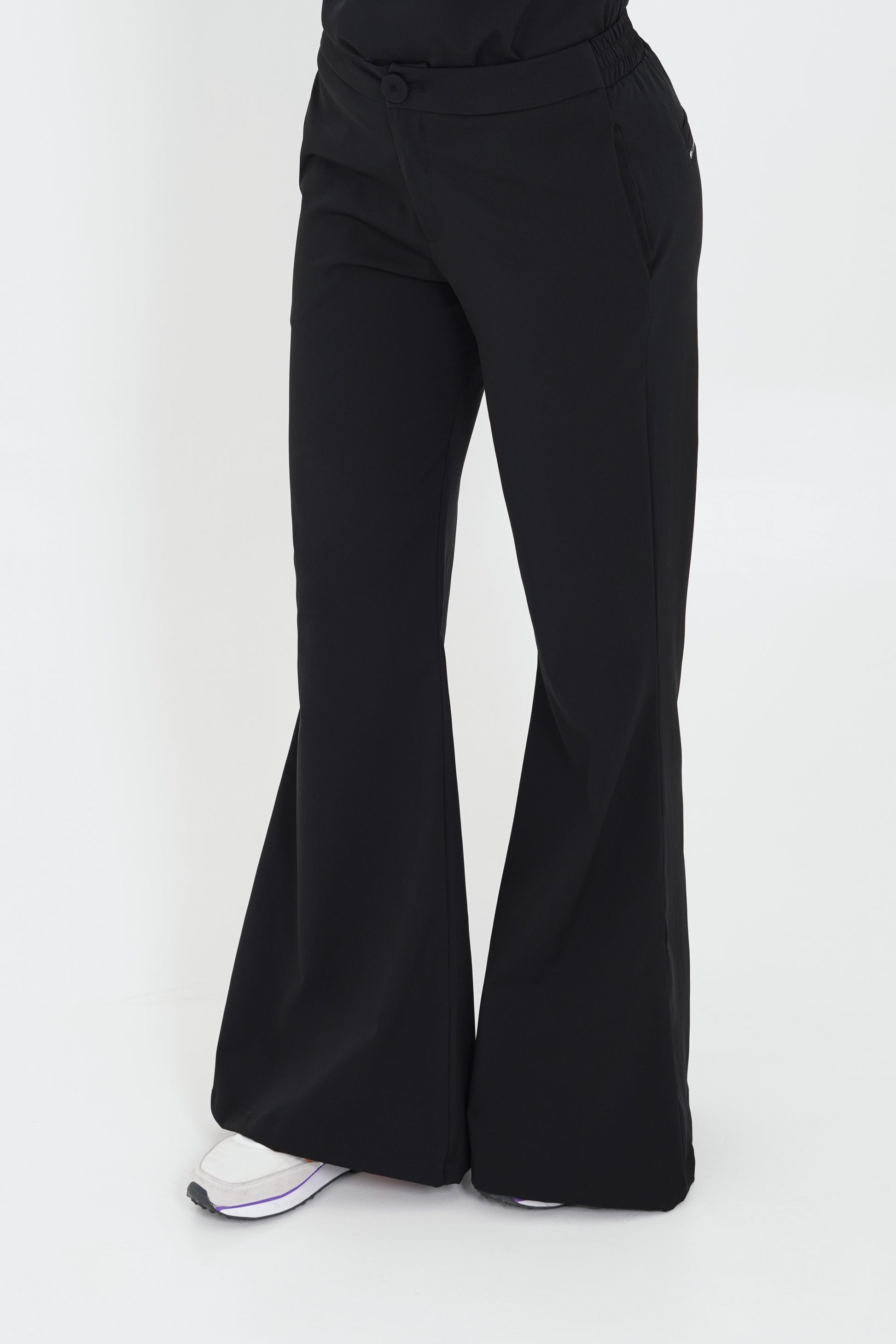 Pantalón bota campana, con ajuste de botón, pretina resortada en la parte de atrás.